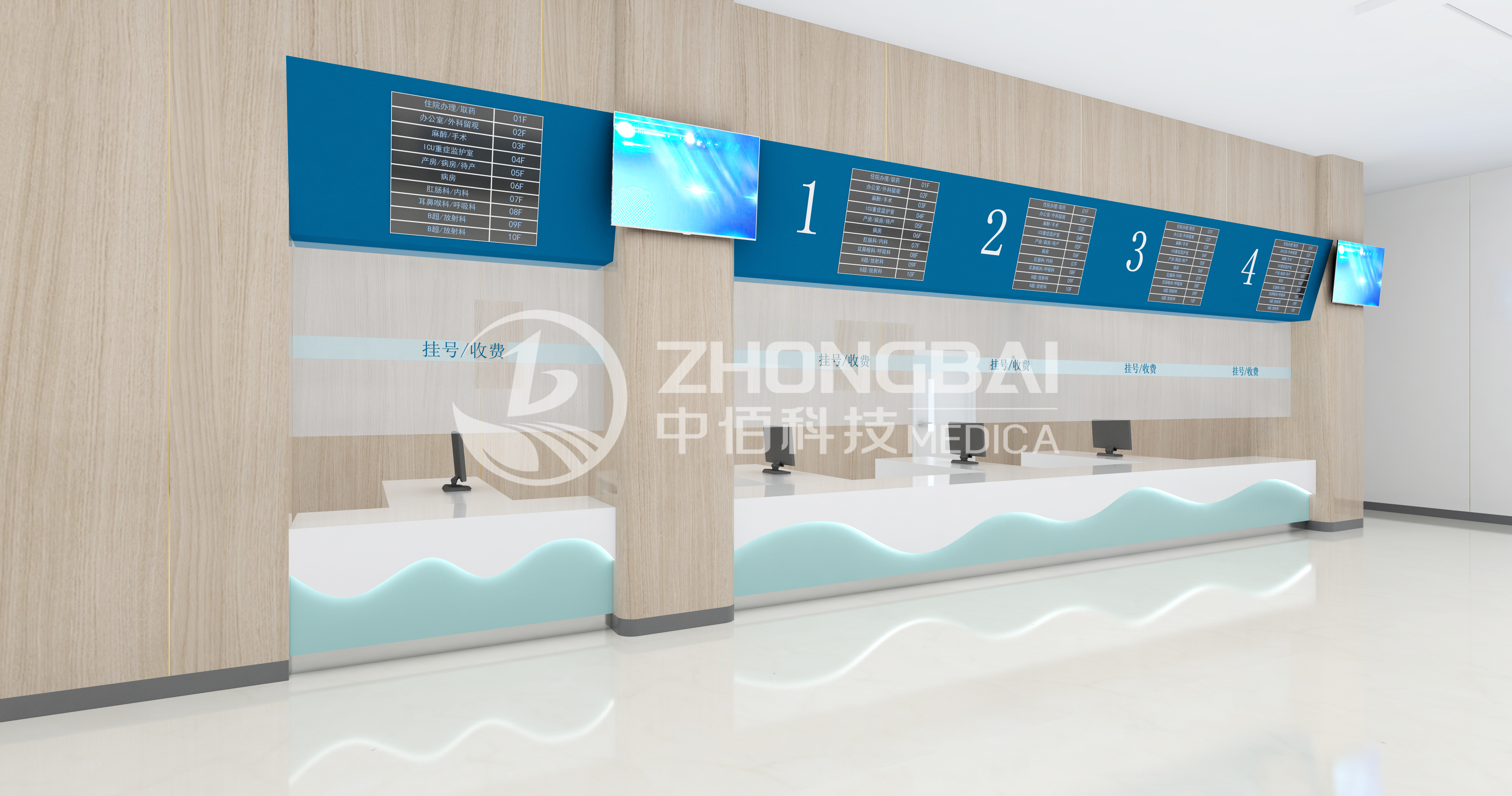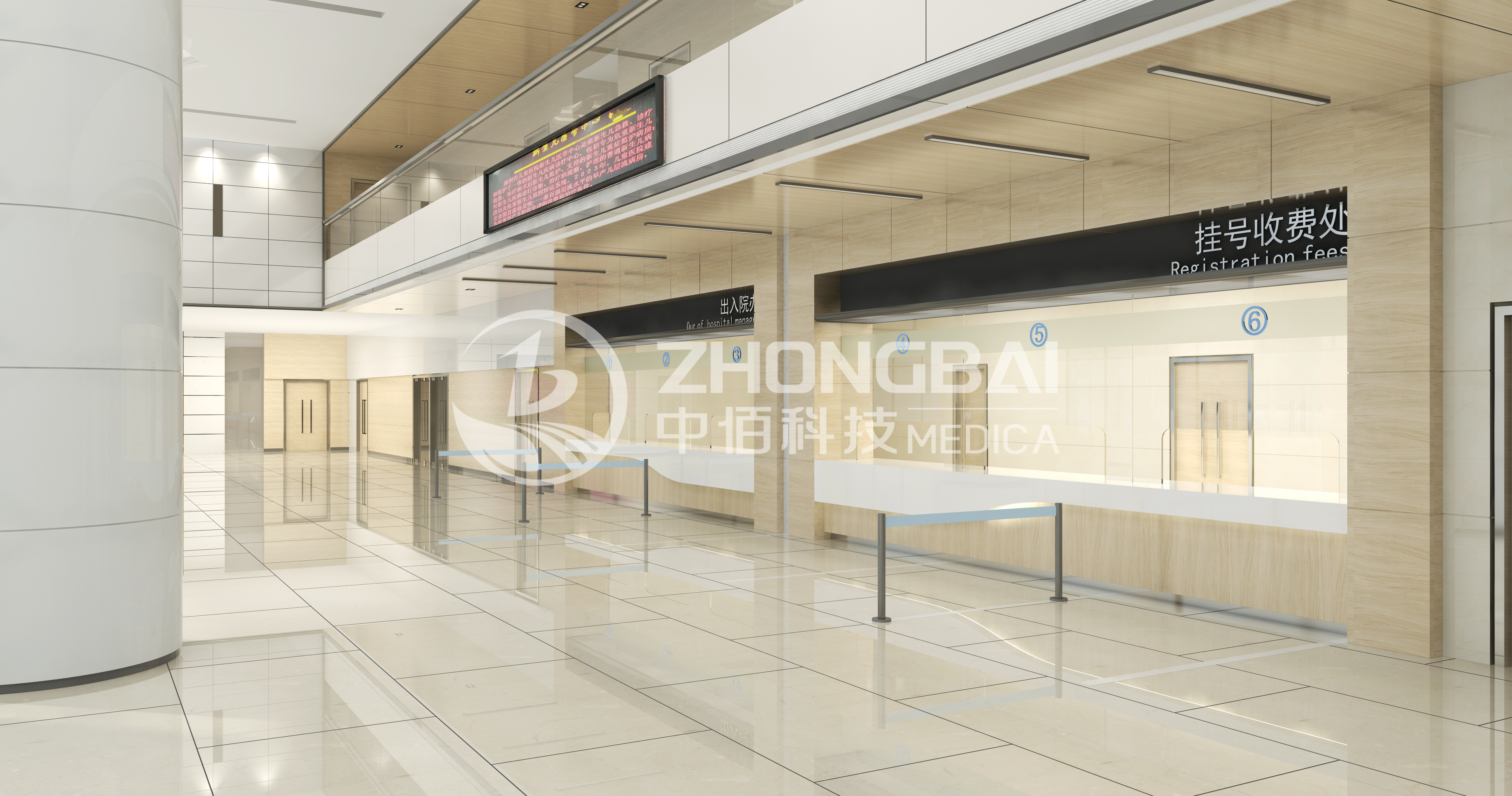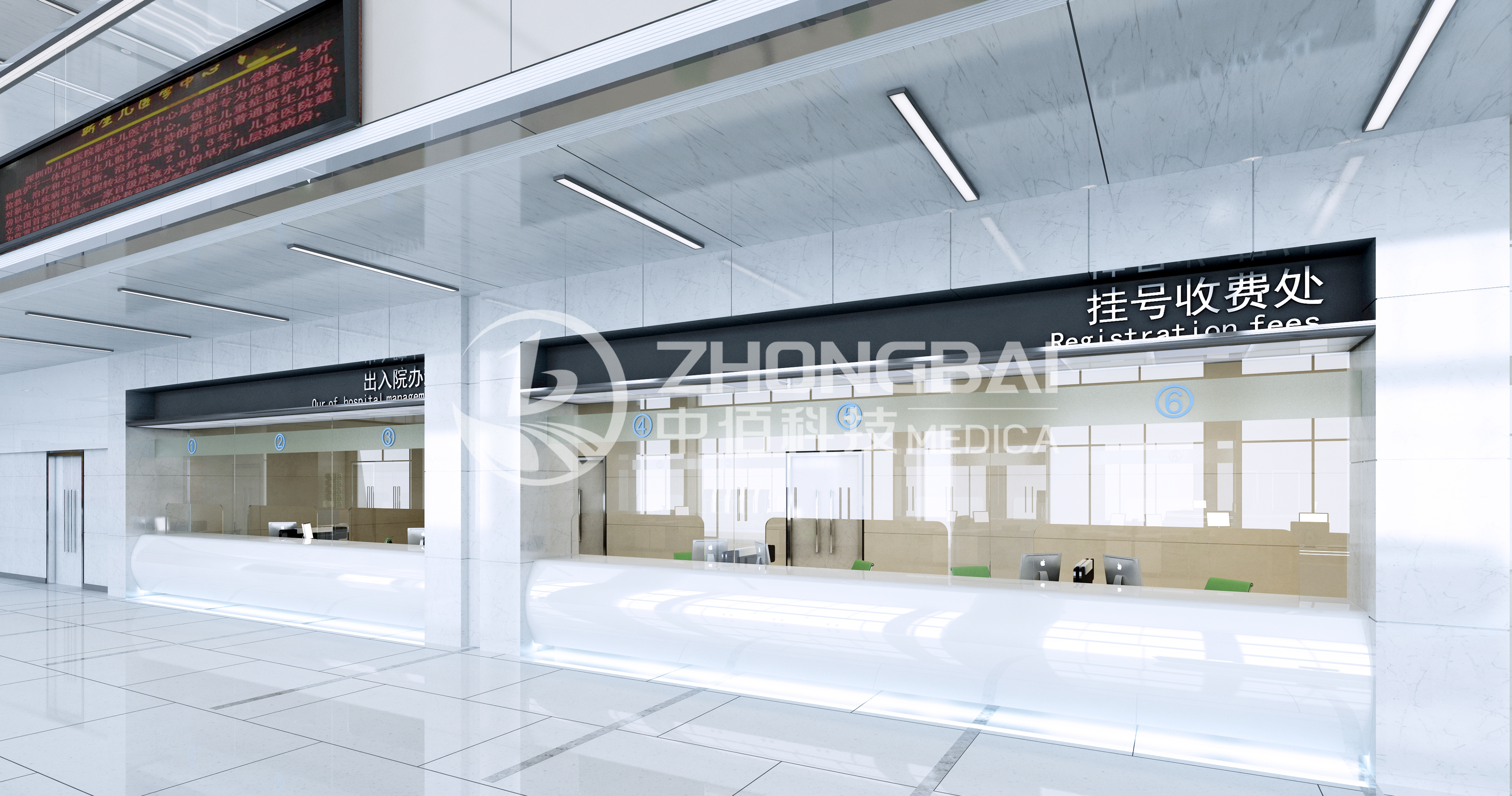 門診收費、掛號單元是直接面向社會的重要窗口,是醫(yī)院服務(wù)形象的展示平面。一般設(shè)置在門診大廳靠近入口位置,為避免集中掛號的擁擠問題、減少患者排隊等候時間,可設(shè)置分層收費掛號窗口,優(yōu)化門診流程。